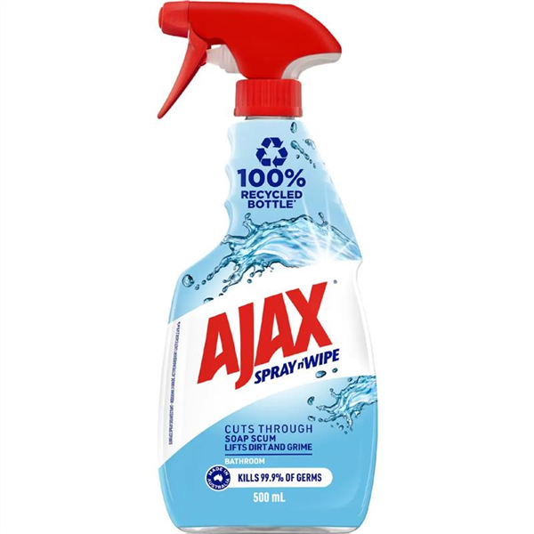 Ajax Spray n' Wipe Bathroom is a Household Grade Antibacterial Disinfectant Cleaner Trigger Surface Spray; Soap Scum Remover, made in Australia with a 100% recycled bottle