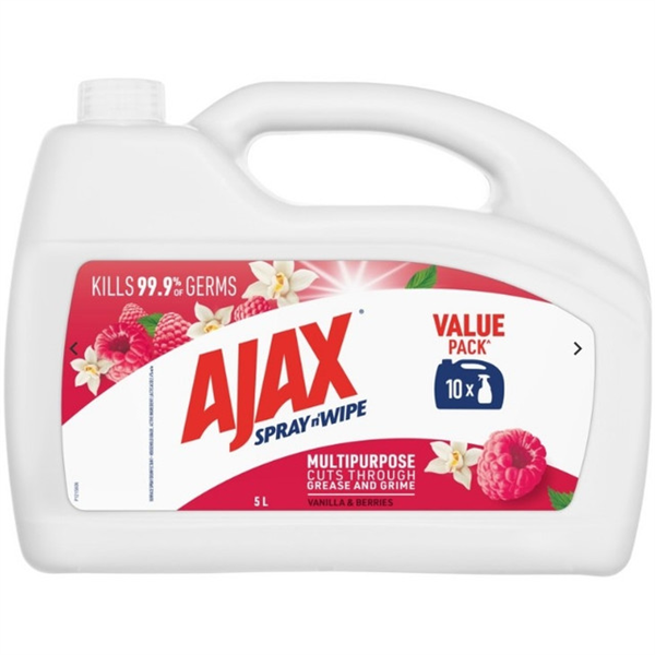 Ajax Spray n Wipe Vanilla Berries 5L is a ready-to-use multi-purpose cleaner designed for fast and effective cleaning of hard surfaces