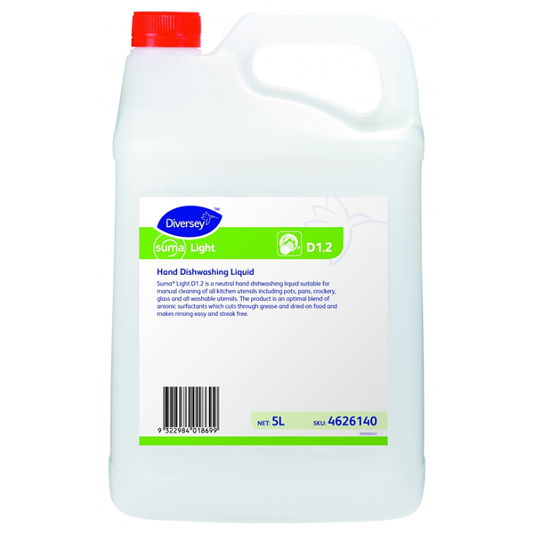 Diversey Suma Light D1.2 is a concentrated manual dishwashing detergent formulated for effective cleaning of crockery, glassware, pots, pans, and kitchen utensils