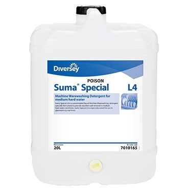 Diversey Suma Special L4 is a highly alkaline liquid detergent formulated for machine dishwashing in hard water conditions