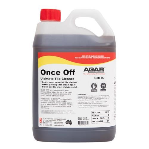 Once Off is a very concentrated, highly alkaline tile cleaner with water-softening and degreasing properties