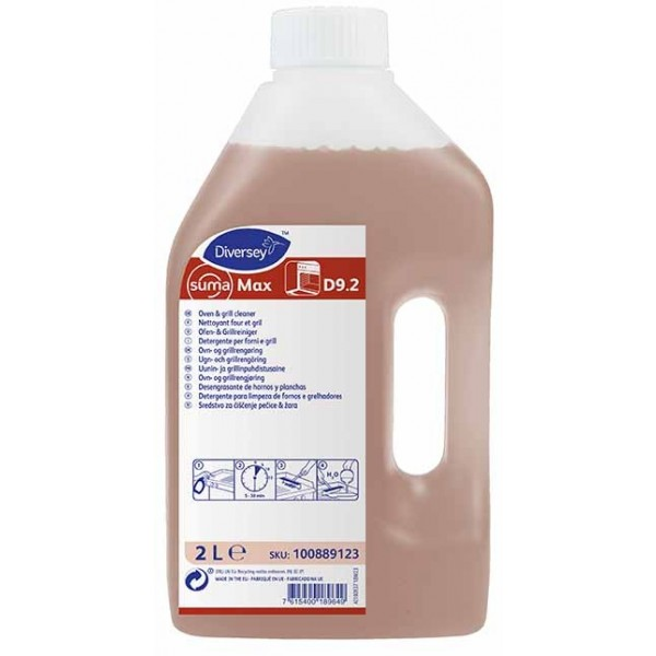 Diversey Suma Max Oven & Grill D9.2 2L is a powerful heavy-duty cleaner formulated to remove burnt-on grease, carbon deposits and food residues