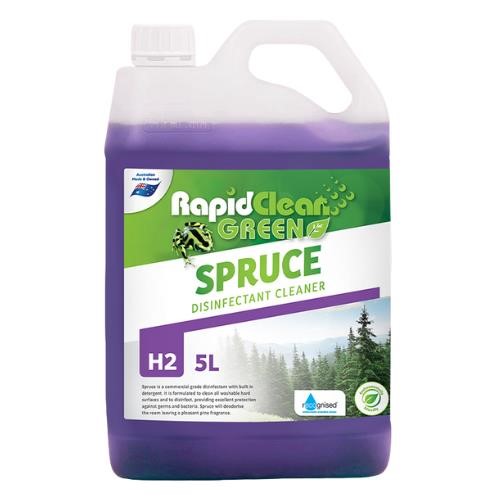 RapidClean Spruce Disinfectant is a clear purple coloured liquid that contains a combination of cleaning agents and highly effective quaternary sanitisers plus a long lasting pine residual perfume