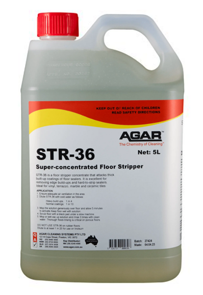 Agar STR-36 is a super-concentrated, low-foaming floor stripper formulated to rapidly dissolve and remove stubborn water-based sealers, polishes, and semi-permanent coatings