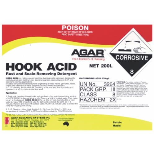 Agar Hook Acid Rust and Scale Removing Detergent is a free-rinsing, low-foaming, highly concentrated acidic detergent designed for C.I.P applications, descaling stainless steel, removing mineral deposits and removing rust and scale from meat hooks, rollers and gambrels in abattoirs and meat processing works
