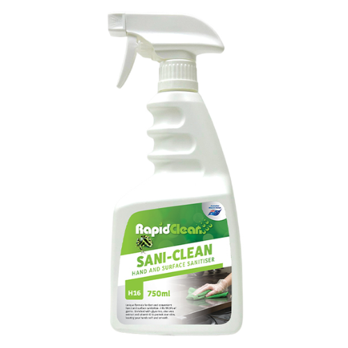 RapidClean Sani-Clean Hand and Surface Sanitiser 750ml is a ready-to-use alcohol-based sanitiser formulated for quick and effective disinfection of hands and hard surfaces