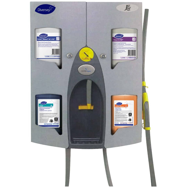 Diversey J-Fill Select Dispenser SP3746 is a wall-mounted dilution control system designed for accurate dispensing of multiple cleaning chemicals