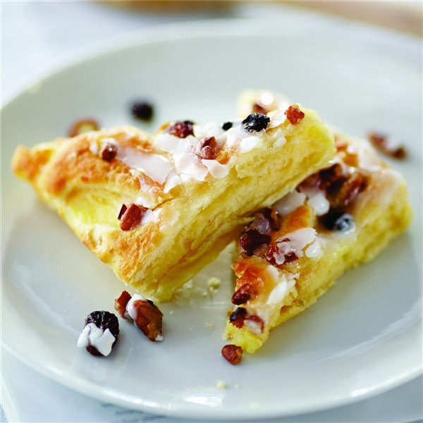 Rich creamy custard filled danish is topped with ribbons of vanilla icing, a sprinkling of dried mixed fruits and pecan nut pieces