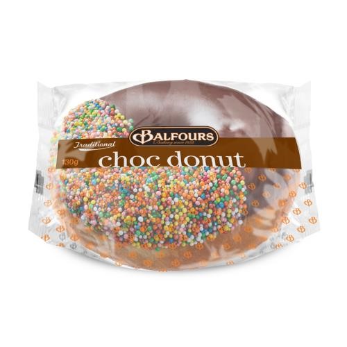 Balfours Donut Choc, chocolate glazed donut sprinkled with hundreds and thousands
