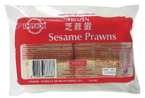 Prawn (55%), bread (22%) [wheat flour, sugar, vegetable shortening, yeast, bread improver (mineral salt (170), antioxidant (330)), salt], sesame seeds