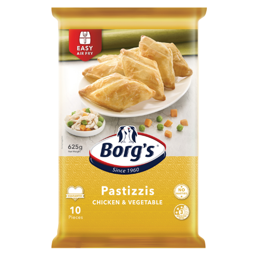 Borgs Pastizzis Chicken & Vegetable are savoury Mediterranean-style pastries filled with tender chicken and mixed vegetables, encased in Borg’s light, flaky pastry