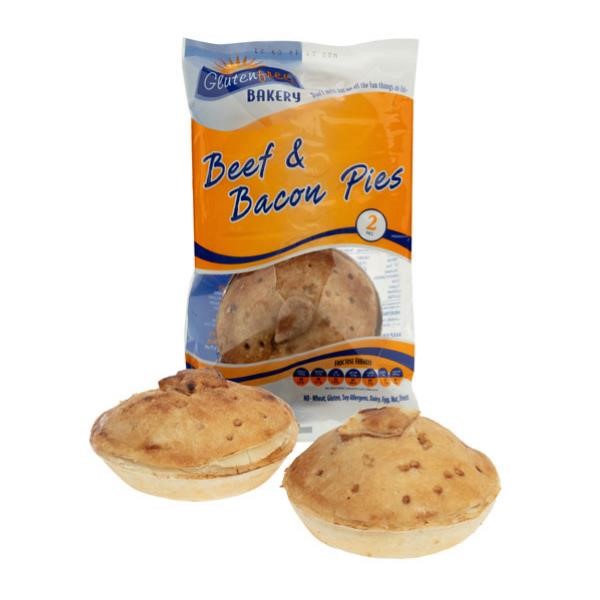 Gluten Free Bakery Beef & Bacon Pies 2/PK are hearty savoury pies filled with seasoned beef and bacon pieces in a gluten-free pastry case