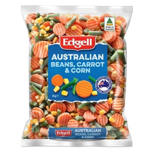 Australian grown & snap frozen Beans, Carrots & Corn vegetable mix with tender cross cut beans, sliced crinkle cut carrot rings and juicy golden corn kernels