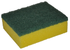 is a compact two-toned scourer sponge combining a green abrasive layer with a yellow absorbent sponge backing
