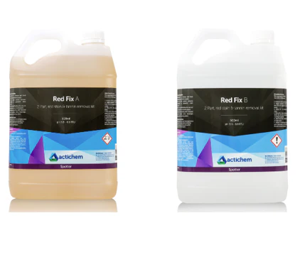 Actichem Red Fix Kit 5L is a specialised stain treatment solution designed to remove stubborn red dye stains caused by wine, cordial, soft drinks, food colouring, and fruit spills