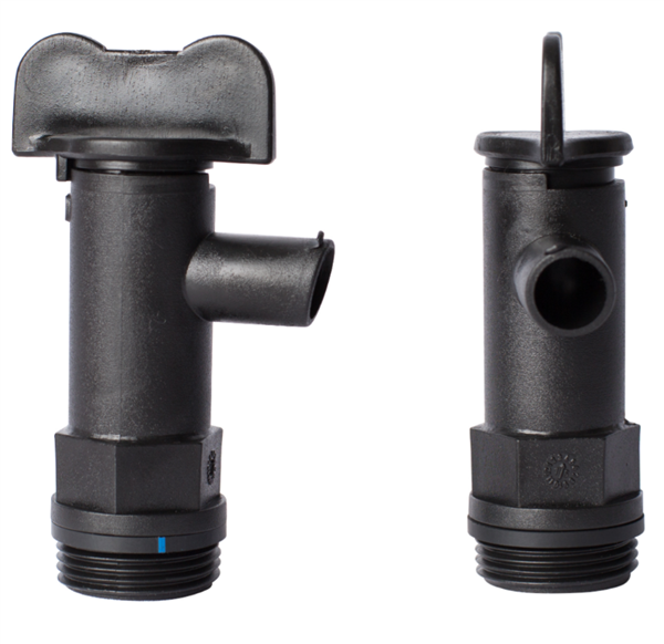 Black plastic tap designed for cube drums with 3/4" thread