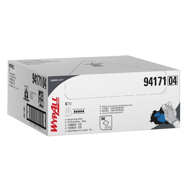 WypAll X70 Single Sheet White 300/CTN 94171 is a heavy-duty disposable wiping cloth designed for demanding cleaning and maintenance tasks
