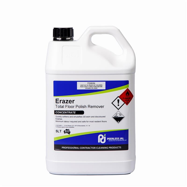 • Peerless Erazer is a heavy-duty, industrial-strength floor stripper engineered to effectively dissolve metal cross-linked sealer and highly burnished polish build-up on resilient floor surfaces
