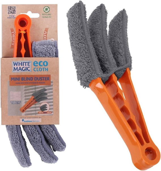 Features three microfibre fingers that slip between slats to trap and lift dust