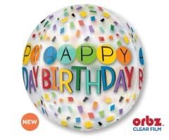 Shape Orbz Happy Birthday Rainbow Confetti 38cm x 40cm Clear Balloon (Self Sealing Balloon, Requires Helium Inflation)