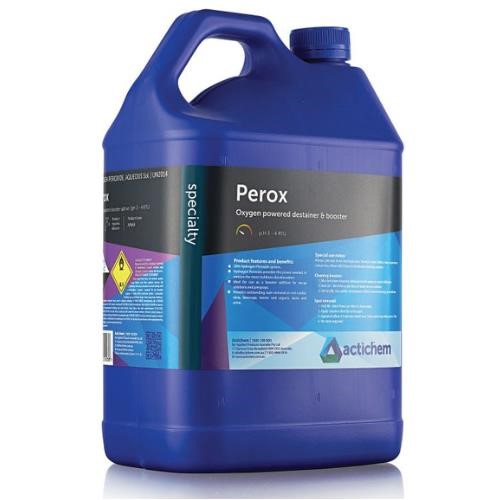Perox is a high strength 50% Hydrogen Peroxide solution, It is popular in commercial laundries for destaining, whitening and low temperature sanitising of garments and linen, Perox is also widely used as a specialty stain remover on carpet, fabric and porous hard surfaces