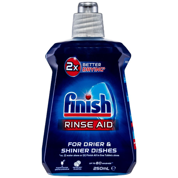Finish Dishwashing Rinse Aid can be used to clear away detergent and food residues from dishes in your dishwasher
