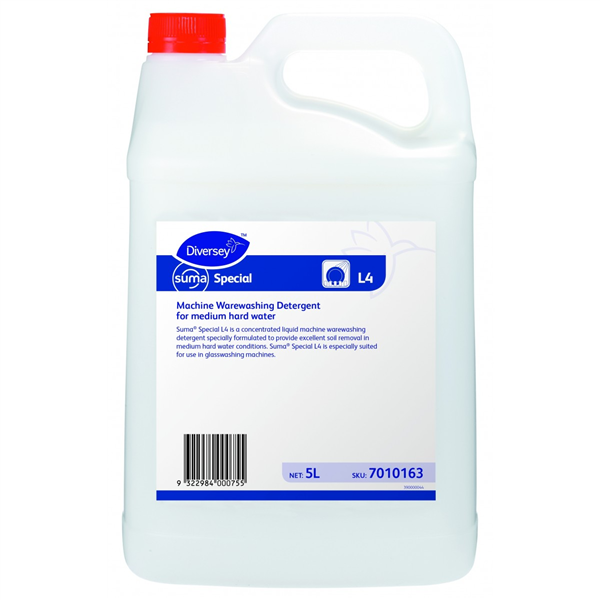 Diversey Suma Special L4 is a highly alkaline liquid detergent formulated for machine dishwashing in hard water conditions