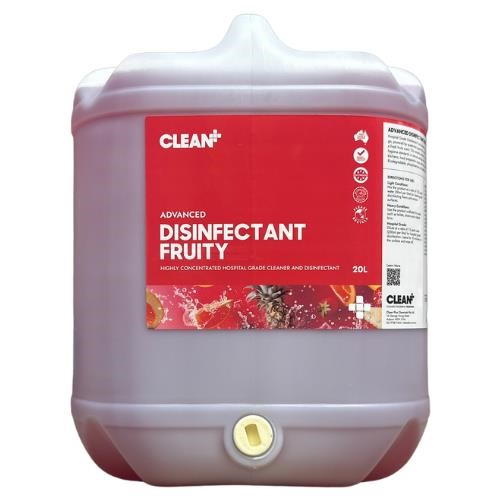 Disinfectant Fruity – Commercial Grade is a red thin liquid with a pleasant fruity fragrance, which deodorises, cleans and disinfects in one action