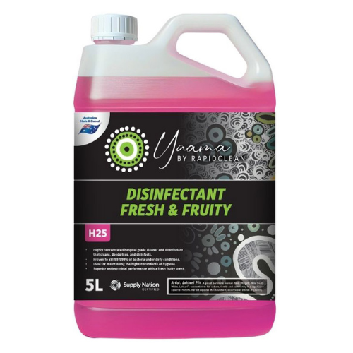 RapidClean Yaama Fresh & Fruity is a highly concentrated hospital-grade cleaner and disinfectant that cleans, deodorises, and disinfects in a single step