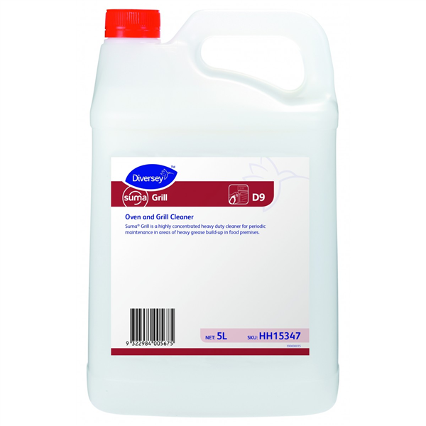 Diversey Suma Grill D9 is a powerful alkaline cleaner formulated to remove heavy grease, carbonised deposits, and burnt-on food residues
