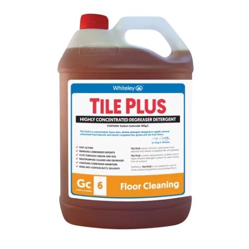 Whiteley Tile Plus is a concentrated heavy-duty alkaline cleaner and degreaser formulated for use on hard surfaces such as tiles, concrete, and stone in industrial, commercial, and food processing areas