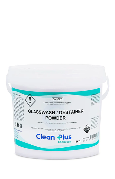Clean Plus Glasswash/Destainer 5kg is a specialised machine warewashing powder designed to clean and destain glassware in commercial dishwashing systems