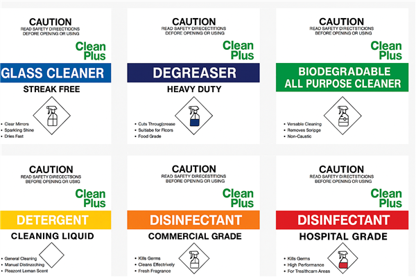 Clear identification of cleaning chemical purpose helps minimise product misuse and supports hygiene compliance