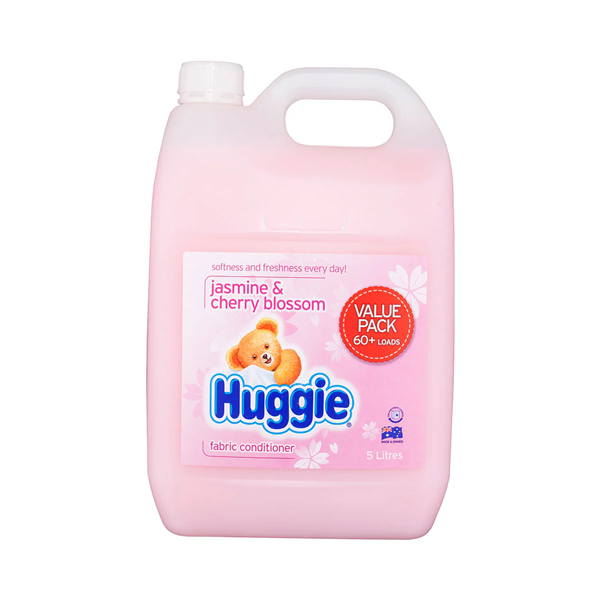 Huggie Fabric Softener Jasmine/Cherry 5L is a premium laundry additive designed to soften fabrics while leaving a long-lasting floral fragrance
