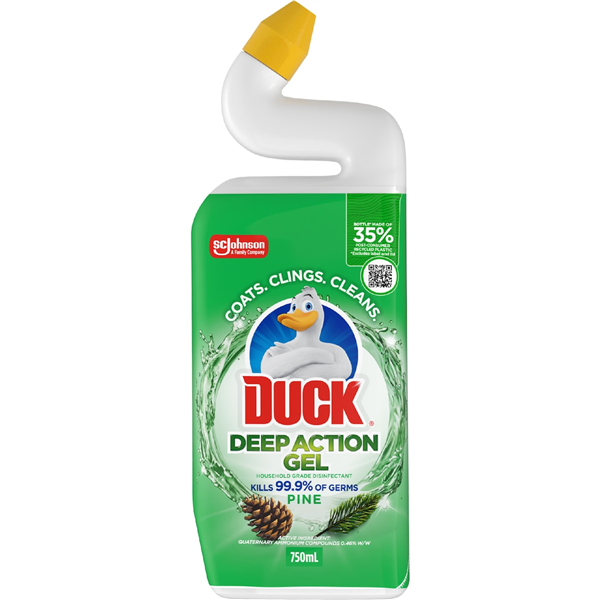Duck Deep Action Gel Pine 750mL is a powerful toilet cleaning gel designed to clean, disinfect, and deodorise toilets with a long-lasting fresh pine fragrance