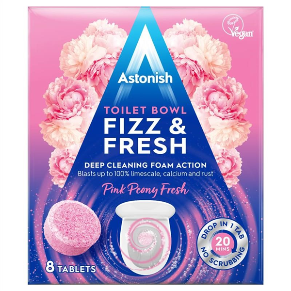 The Astonish Toilet Tablets Pink Peony 8/pk are fast-acting effervescent tablets designed to deep clean and freshen toilet bowls with minimal effort