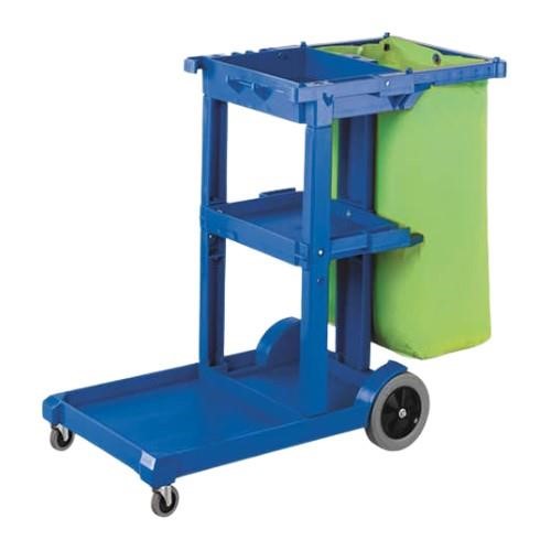 is a sturdy, multi-purpose cleaning trolley designed to organise supplies, tools and waste for professional cleaning teams