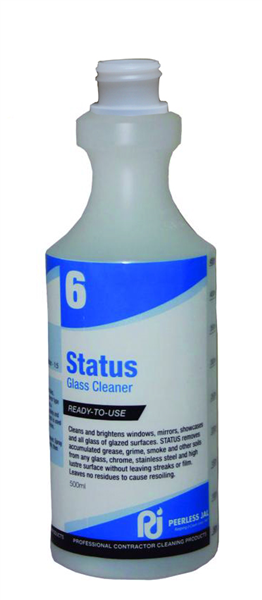 is a durable, pre-printed refill bottle supplied empty and clearly labelled “STATUS” for use with the designated glass and surface cleaner