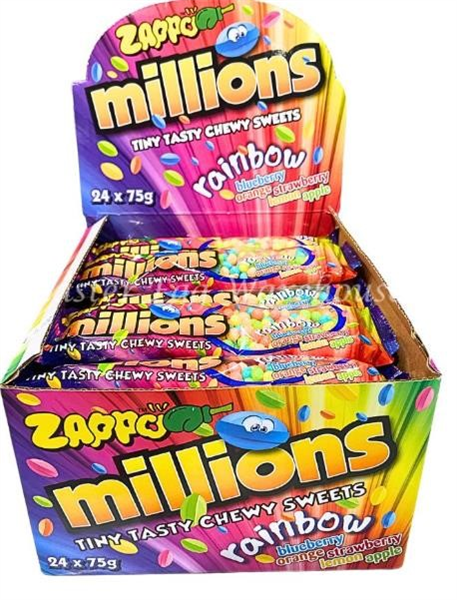 Get ready to taste the rainbow like never before with Zappo Millions Rainbow! This epic mash-up combines the iconic zing of Zappo sour chews with the chewy, juicy pop of Millions mini candies—all wrapped up in a bold rainbow of fruity flavours