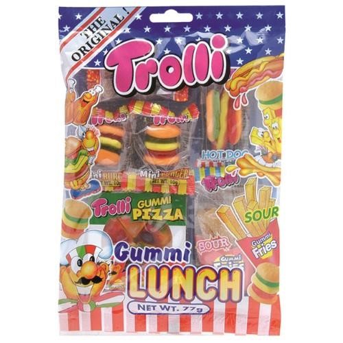 Our Trolli Gummi Lunch Bag includes 2x burgers, 1x pizza, 1x coke bottle, 1x hotdog & fries!