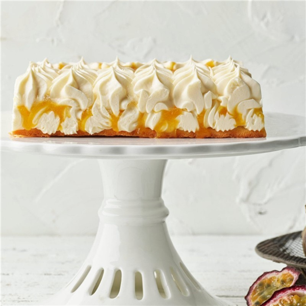 A light vanilla sponge is topped with French cream cheese and flooded with a delightful combination of peach and mango that every summer fruit lover craves