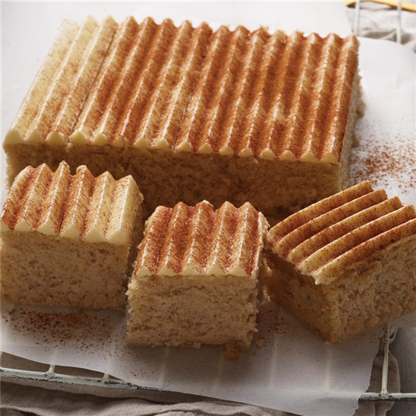 It is topped with a luscious creamy vanilla icing to enhance the cakes full flavour and dusted with a touch of cinnamon