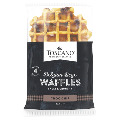 Toscano Waffle Choc Chip 360g is a delicious ready-to-serve waffle featuring a light, fluffy texture filled with rich chocolate chips