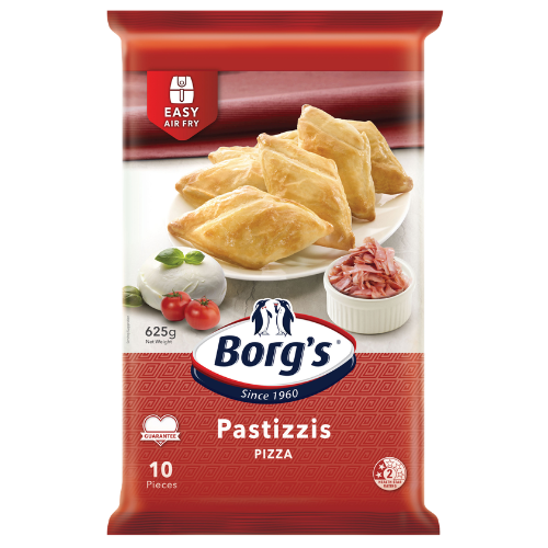 Borgs Pastizzis Pizza Style are savoury Mediterranean-inspired pastries filled with salami, tomato, bacon and mozzarella-style pizza ingredients wrapped in Borg’s light, flaky pastry