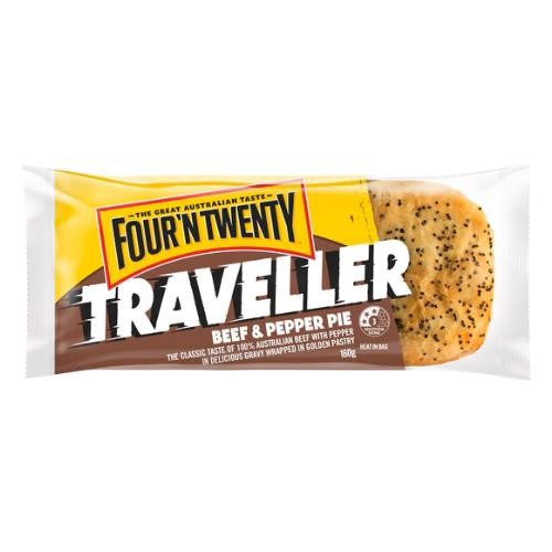Four N Twenty Traveller Beef & Pepper Pie, the classic taste of 100% beef with Pepper in a delicious gravy wrapped in a golden pastry