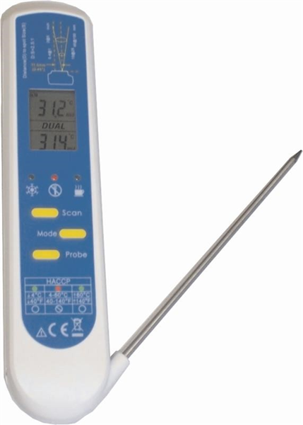 HACCP-Dual Infrared Thermometer and Probe in 1 unit food grade! Probe clips to the side of the unit and folds out to a full 180 degrees ready for temperature measurement