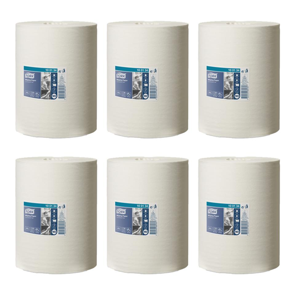 Tork 100134 Centrefeed Wiping Paper is a high-capacity 1-ply roll designed for both hand and light surface wiping in professional environments