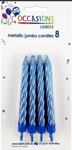 Candles Jumbo Metallic Blue W/Holder 8/Pk 431153
