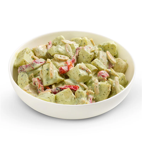 Perfect for any occasion, this dish combines the heartiness of potatoes, the crunch of slivered almonds, and the sweetness of red capsicum, all tied together in a delicious pesto mayonnaise