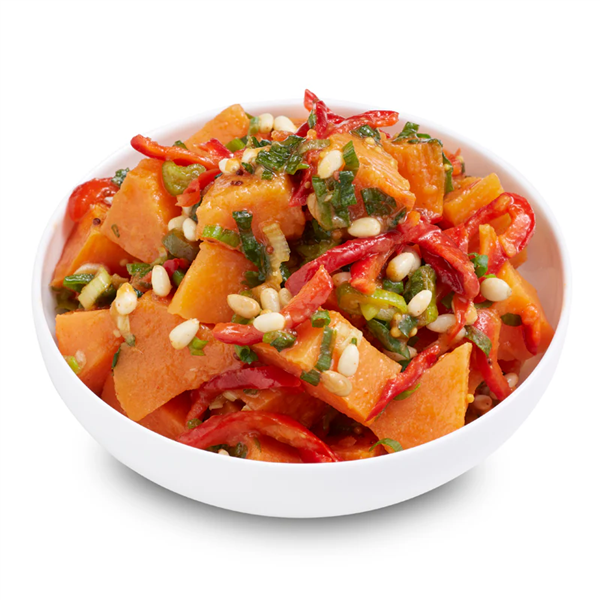 Level up your side dish at your next party, barbeque or gathering with roasted hand-cut sweet potato, served with pine nuts and fresh veggies and tossed in a sesame oil dressing